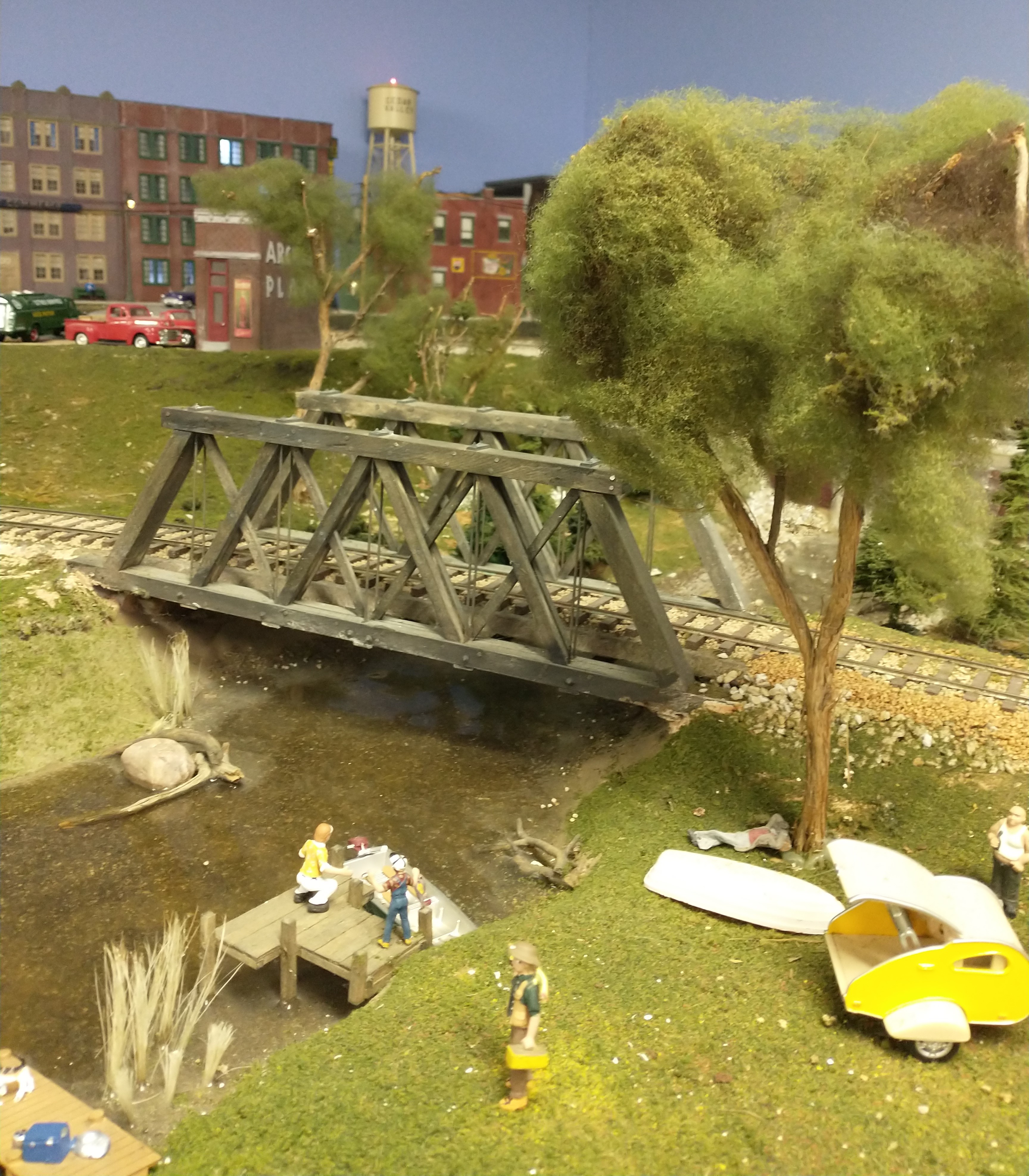 The layout has approximately 220 feet of main line track, a 135-foot branch line, a large switching yard, engine facility with turntable and roundhouse and numerous storage tracks. Four power transformers and block control permits multiple train operations. Scenery on the railroad is based on generic Iowa landscape and will include both farmland and rural towns. As construction continues, special features will include grain- loading facilities, power plant with facilities for unloading coal, manufacturing plants, junk yard and other facilities.